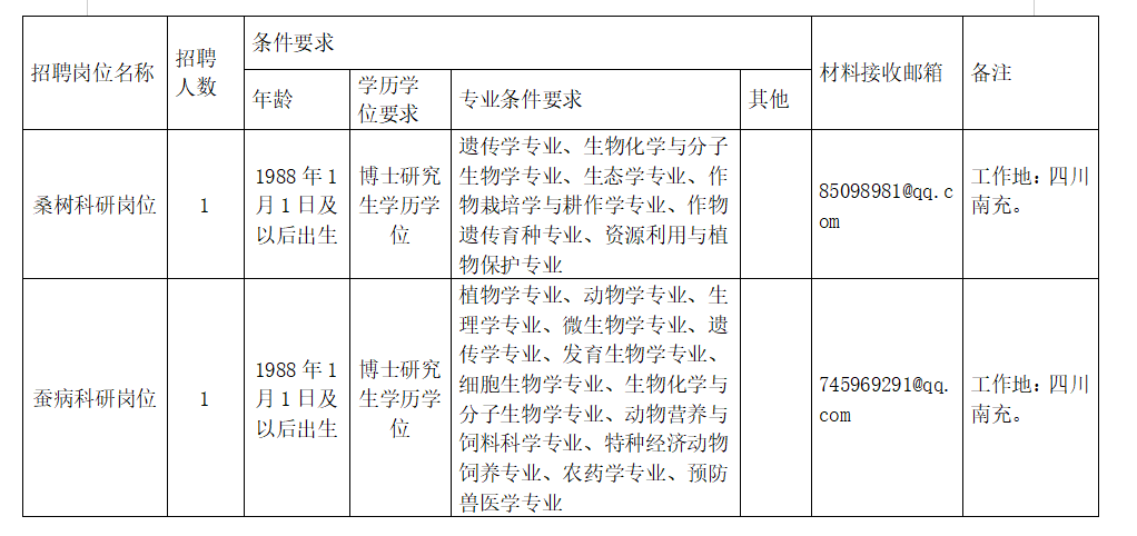 2.应聘人员将身份证、学历学位证书、近5年主要科研业绩成果(在核心期刊发表的论文清单及代表性学术论文、获奖情况、主持项目、审定品种、专利等)材料以及联系方式发至指定邮箱(桑树科研岗位应聘人员材料请发85098981@qq.com,蚕病科研岗位应聘人员材料请发745969291@qq.com),邮件主题请注明“所学专业名称+姓名+应聘岗位”,如“生物学+李某+蚕病科研岗位”。