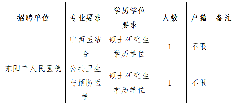 3.资格审核:招聘单位将根据招聘岗位及条件要求,对应聘人员的报名材料进行初审,初审通过后,由东阳市卫生健康局进行复核。