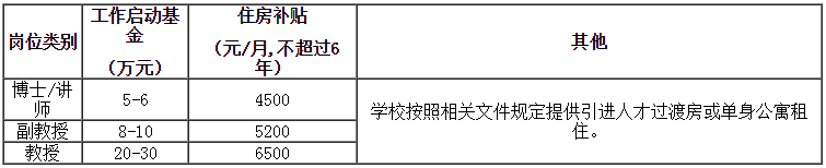 学校根据聘期工作目标及任务、学科类型等不同情况,结合国家提供的经费,配套相应科研启动经费、薪酬(可实行年薪制或人才津贴制)、实验及工作场所、科研助手、住房待遇等(基本标准见下表,学院可进行待遇补充,一人一议)。