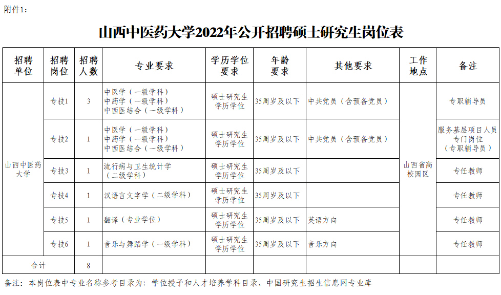 山西中医药大学2022年公开招聘硕士研究生工作人员8名,均为专业技术岗位。招聘岗位所需的具体条件以《山西中医药大学2022年公开招聘硕士研究生岗位表》(附件1)的要求为准。