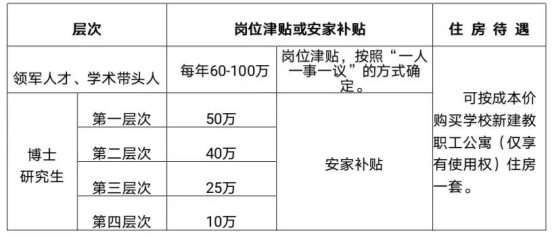 1.学校为不同引进层次人才按照已取得业绩成果,提供相应岗位津贴或安家补贴,以及住房待遇。具体引进层次及相应津补贴、住房待遇为: