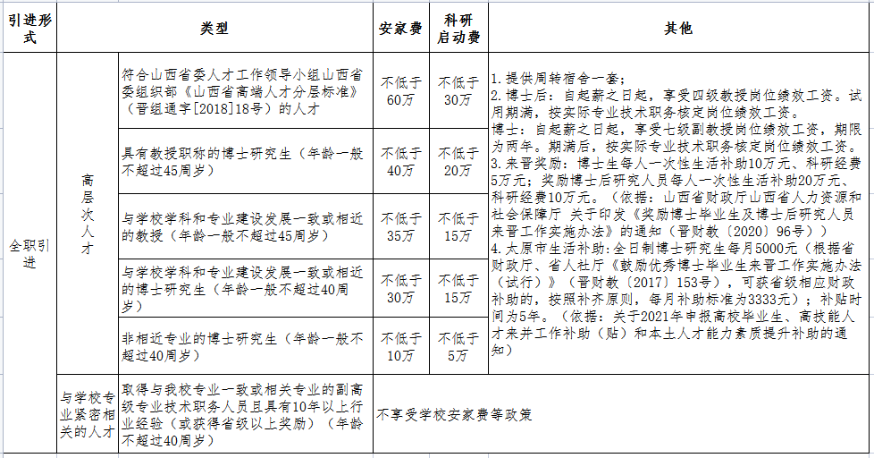 符合山西省、太原市引进人才奖励条件的,由学校审核推荐,上报省、市审核确认,按照相关奖励政策,除享受学校给予的待遇外,同时享受山西省、太原市提供的相关人才奖励待遇。