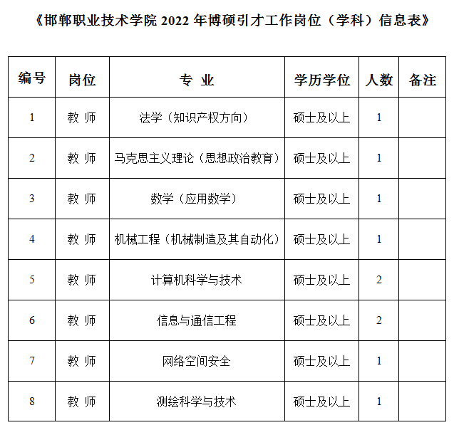 本次共引进博硕人才10名,工作岗位详见附表一《邯郸职业技术学院2022年博硕引才工作岗位(学科)信息表》。