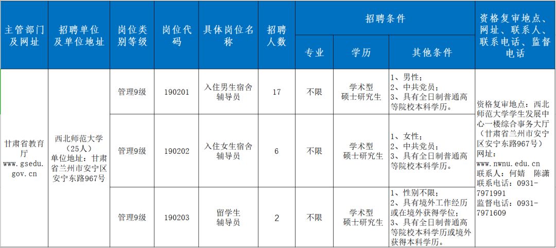 具体岗位及岗位招聘条件见《西北师范大学2019年公开招聘专职辅导员岗位列表》。