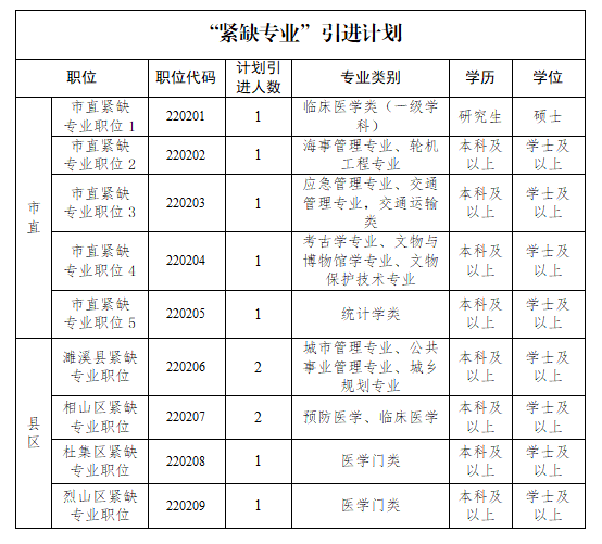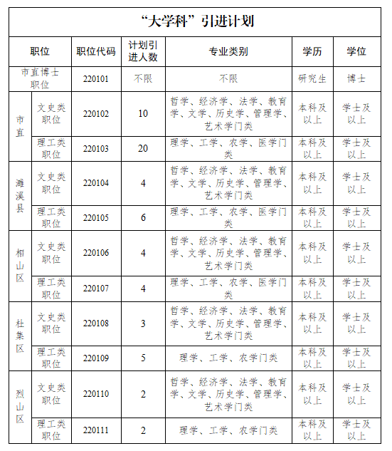 采取“大学科”+“紧缺专业”形式,市县(区)“大学科”计划引进博士人数不限、文史类23名、理工类37名,“紧缺专业”计划引进11名(岗位如下):