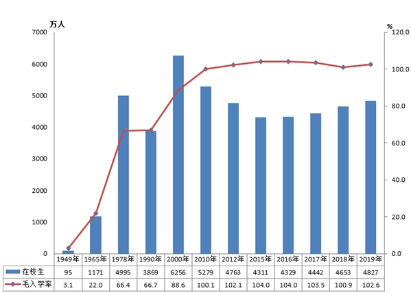 [4]毛入学率,是指某一级教育不分年龄的在校学生总数占该级教育国家规定年龄组人口数的百分比。由于包含非正规年龄组(低龄或超龄)学生,毛入学率可能会超过100%。