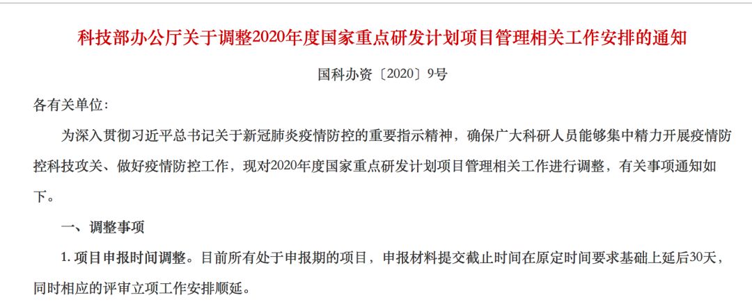 今天(2月13日),科技部办公厅下发《关于调整2020年度国家重点研发计划项目管理相关工作安排的通知》,对2020年度国家重点研发计划项目管理相关工作进行调整。