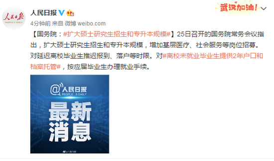 [国务院:#扩大硕士研究生招生和专升本规模#]25日召开的国务院常务会议指出,扩大硕士研究生招生和专升本规模,增加基层医疗、社会服务等岗位招募。对延迟离校毕业生推迟报到、落户等时限。对#离校未就业毕业生提供2年户口和档案托管#,按应届毕业生办理就业手续。