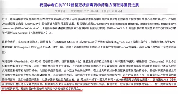 2月4日,官网发布消息称,中国科学院武汉病毒研究所/生物安全大科学研究中心、军事科学院军事医学研究院国家应急防控药物工程技术研究中心,在1月21日申报了瑞得西韦(Remdesivir)的中国发明专利(抗2019新型冠状病毒的用途),并将通过PCT(专利合作协定)途径进入全球主要国家。