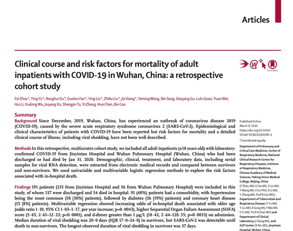 论文统计了191例患者的临床数据。他们全部来自武汉金银潭医院和武汉市肺科医院——武汉最早的两家定点医院。