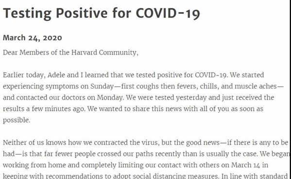 3月24日,哈佛官网公开了一份题为“新冠病毒病监测阳性”的声明。在声明中,校长巴考确认自己和妻子已确诊感染新冠病毒。